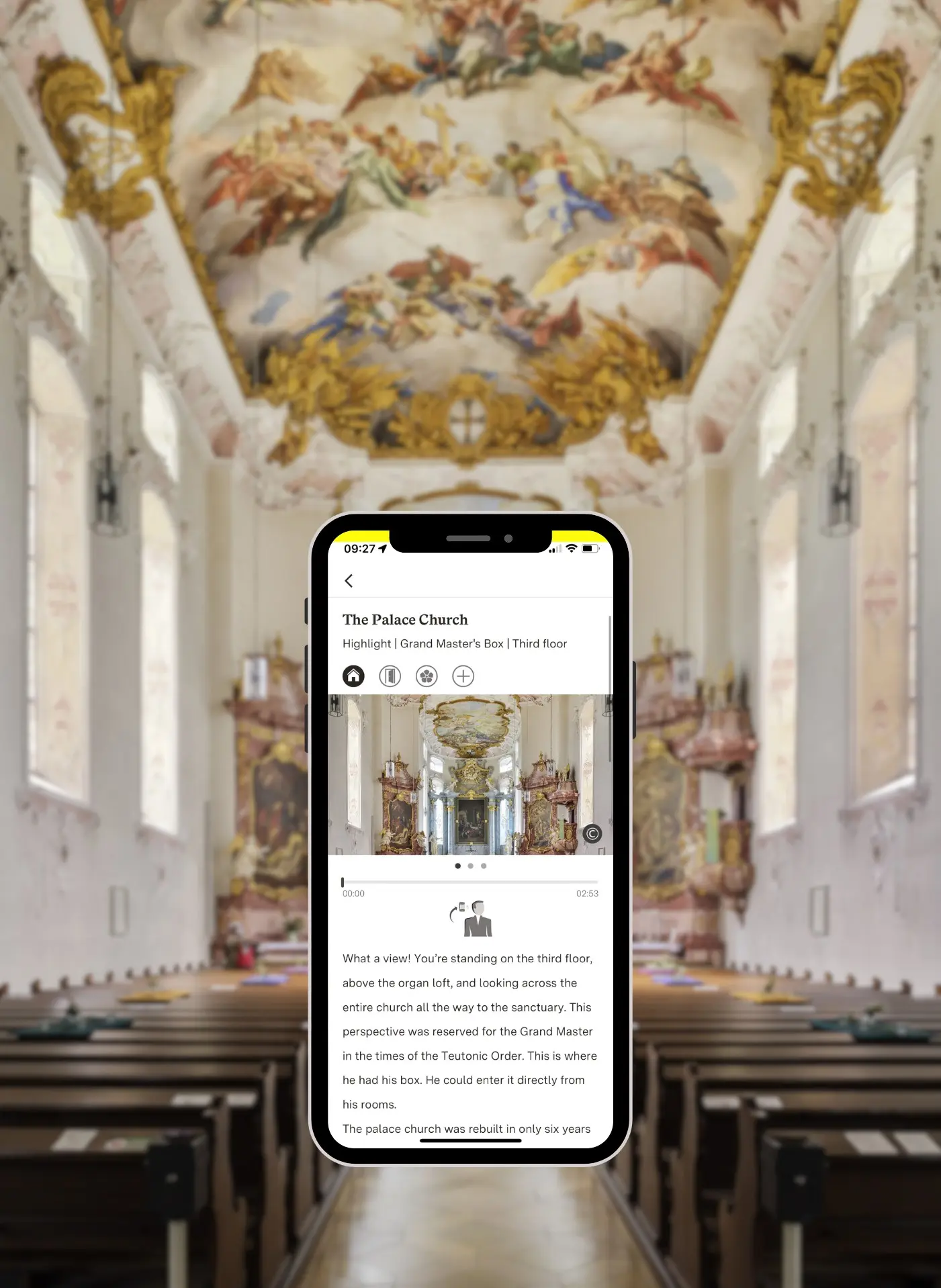 Now you can explore the history of the residential palace on site with “Monument BW” – the app for your smartphone or tablet. Impressive images, videos, and audios bring the history of the former moated castle to life and offer a glimpse behind the scenes. But the app has even more to offer than this: you’ll find information on lots of other monuments in the region, too.